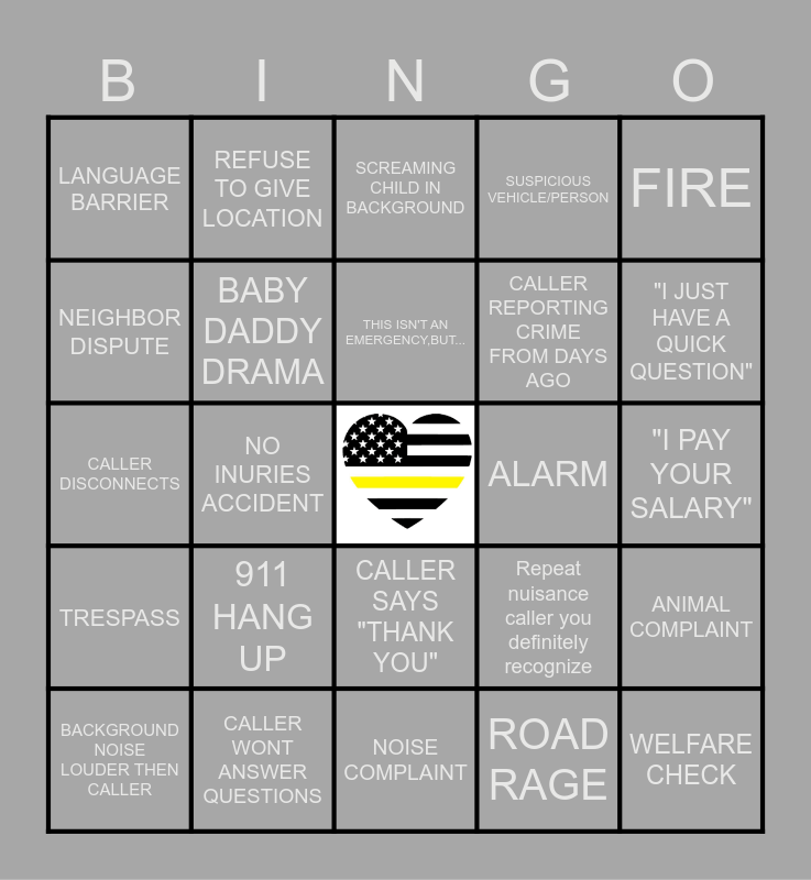 This bingo card has a free space and 24 words: 911 HANG UP, CALLER WONT ANSWER QUESTIONS, THIS ISN'T AN EMERGENCY,BUT..., BACKGROUND NOISE LOUDER THEN CALLER, FIRE, LANGUAGE BARRIER, NEIGHBOR DISPUTE, REFUSE TO GIVE LOCATION, ALARM, CALLER SAYS "THANK YOU", CALLER REPORTING CRIME FROM DAYS AGO, CALLER DISCONNECTS, Repeat nuisance caller you definitely recognize, ANIMAL COMPLAINT, BABY DADDY DRAMA, ROAD RAGE, "I PAY YOUR SALARY", SCREAMING CHILD IN BACKGROUND, "I JUST HAVE A QUICK QUESTION", NO INURIES ACCIDENT, WELFARE CHECK, TRESPASS, SUSPICIOUS VEHICLE/PERSON and NOISE COMPLAINT.