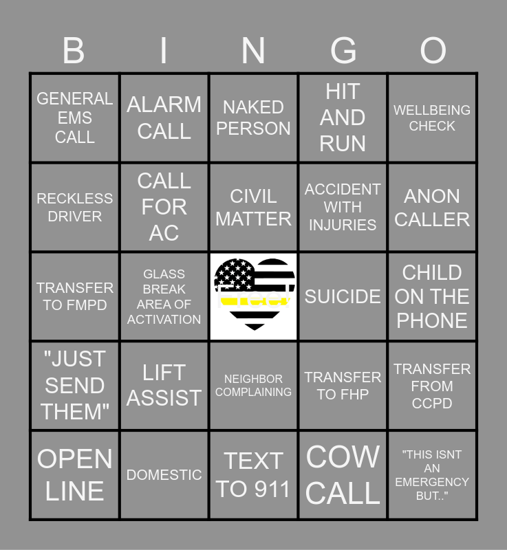 This bingo card has a free space and 24 words: LIFT ASSIST, DOMESTIC, CIVIL MATTER, OPEN LINE, WELLBEING CHECK, GENERAL EMS CALL, RECKLESS DRIVER, ALARM CALL, SUICIDE, NEIGHBOR COMPLAINING, ACCIDENT WITH INJURIES, TRANSFER TO FMPD, TRANSFER TO FHP, TRANSFER FROM CCPD, CALL FOR AC, COW CALL, CHILD ON THE PHONE, NAKED PERSON, ANON CALLER, GLASS BREAK AREA OF ACTIVATION, "THIS ISNT AN EMERGENCY BUT..", "JUST SEND THEM", HIT AND RUN and TEXT TO 911.