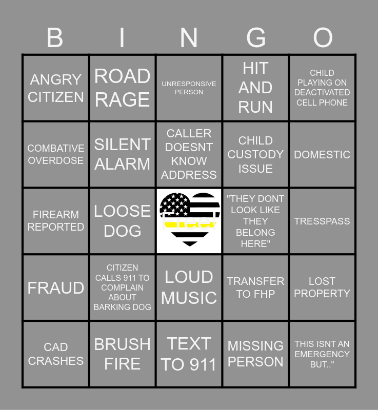 This bingo card has a free space and 24 words: CITIZEN CALLS 911 TO COMPLAIN ABOUT BARKING DOG, BRUSH FIRE, CALLER DOESNT KNOW ADDRESS, CAD CRASHES, CHILD PLAYING ON DEACTIVATED CELL PHONE, ANGRY CITIZEN, COMBATIVE OVERDOSE, ROAD RAGE, "THEY DONT LOOK LIKE THEY BELONG HERE", LOUD MUSIC, CHILD CUSTODY ISSUE, FIREARM REPORTED, TRANSFER TO FHP, LOST PROPERTY, SILENT ALARM, MISSING PERSON, TRESSPASS, UNRESPONSIVE PERSON, DOMESTIC, LOOSE DOG, THIS ISNT AN EMERGENCY BUT..", FRAUD, HIT AND RUN and TEXT TO 911.