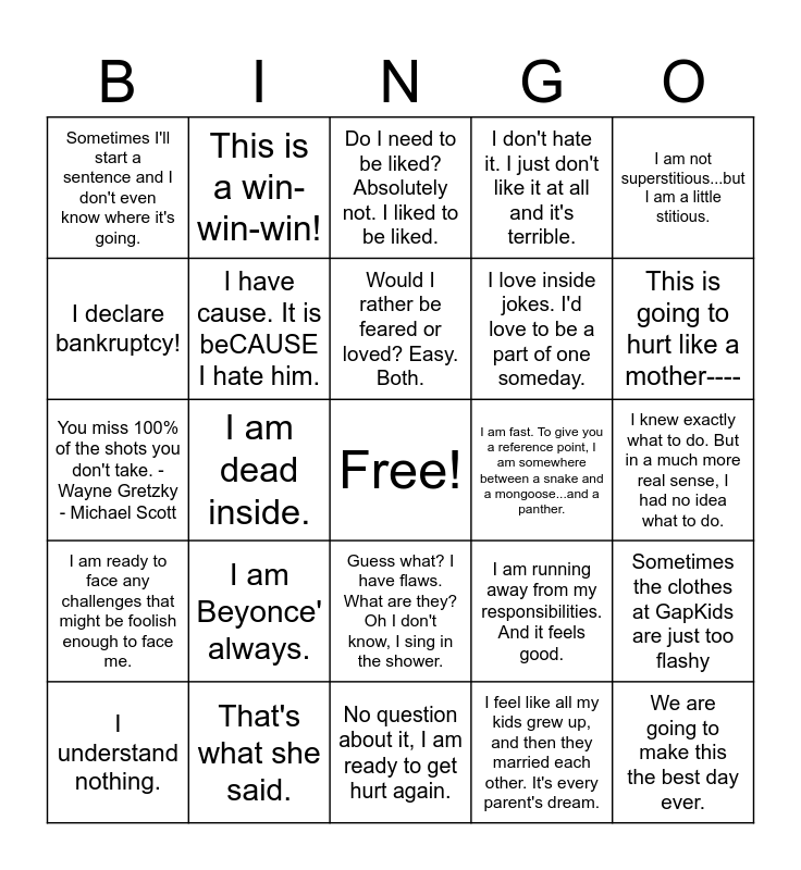 This bingo card has a free space and 24 words: I am Beyonce' always., That's what she said., Would I rather be feared or loved? Easy. Both., I understand nothing., I am not superstitious...but I am a little stitious., Sometimes I'll start a sentence and I don't even know where it's going., I declare bankruptcy!, This is a win-win-win!, I am fast. To give you a reference point, I am somewhere between a snake and a mongoose...and a panther., Guess what? I have flaws. What are they? Oh I don't know, I sing in the shower., I love inside jokes. I'd love to be a part of one someday., You miss 100% of the shots you don't take. -Wayne Gretzky - Michael Scott, I am running away from my responsibilities. And it feels good., Sometimes the clothes at GapKids are just too flashy, I have cause. It is beCAUSE I hate him., I feel like all my kids grew up, and then they married each other. It's every parent's dream., I knew exactly what to do. But in a much more real sense, I had no idea what to do., Do I need to be liked? Absolutely not. I liked to be liked., This is going to hurt like a mother----, I am dead inside., We are going to make this the best day ever., I am ready to face any challenges that might be foolish enough to face me., I don't hate it. I just don't like it at all and it's terrible. and No question about it, I am ready to get hurt again..