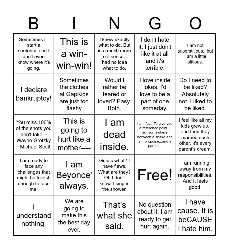 This bingo card has 25 words: I am Beyonce' always., That's what she said., Would I rather be feared or loved? Easy. Both., I understand nothing., I am not superstitious...but I am a little stitious., Sometimes I'll start a sentence and I don't even know where it's going., I declare bankruptcy!, This is a win-win-win!, I am fast. To give you a reference point, I am somewhere between a snake and a mongoose...and a panther., Guess what? I have flaws. What are they? Oh I don't know, I sing in the shower., I love inside jokes. I'd love to be a part of one someday., You miss 100% of the shots you don't take. -Wayne Gretzky - Michael Scott, Free!, I am running away from my responsibilities. And it feels good., Sometimes the clothes at GapKids are just too flashy, I have cause. It is beCAUSE I hate him., I feel like all my kids grew up, and then they married each other. It's every parent's dream., I knew exactly what to do. But in a much more real sense, I had no idea what to do., Do I need to be liked? Absolutely not. I liked to be liked., This is going to hurt like a mother----, I am dead inside., We are going to make this the best day ever., I am ready to face any challenges that might be foolish enough to face me., I don't hate it. I just don't like it at all and it's terrible. and No question about it, I am ready to get hurt again..