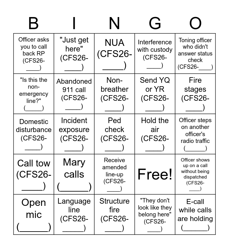 This bingo card has 25 words: Mary calls (_____), Structure fire (CFS26-____), Non-breather (CFS26-____), Open mic (_____), Toning officer who didn't answer status check (CFS26-____), Officer asks you to call back RP (CFS26-____), "Is this the non-emergency line?" (_____), "Just get here" (CFS26-____), Hold the air (CFS26-____), Receive amended line-up (CFS26-____), Send YQ or YR (CFS26-____), Domestic disturbance (CFS26-____), Free!, Officer shows up on a call without being dispatched (CFS26- ____), Abandoned 911 call (CFS26-____), E-call while calls are holding (______), Officer steps on another officer's radio traffic (______), NUA (CFS26-____), Fire stages (CFS26-____), Incident exposure (CFS26-____), Ped check (CFS26-____), Language line (CFS26-_____), Call tow (CFS26-____), Interference with custody (CFS26-____) and "They don't look like they belong here" (CFS26-____).