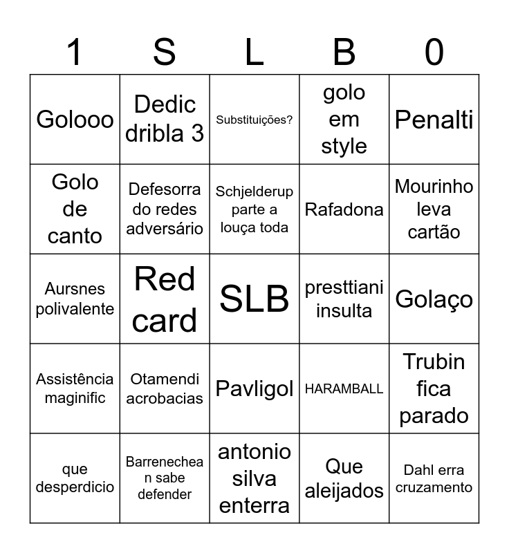 This bingo card has a free space and 25 words: Otamendi acrobacias, antonio silva enterra, Schjelderup parte a louça toda, que desperdicio, Penalti, Golooo, Golo de canto, Dedic dribla 3, presttiani insulta, Pavligol, Rafadona, Aursnes polivalente, HARAMBALL, Trubin fica parado, Defesorra do redes adversário, Defesaça do trubin, Golaço, Substituições?, Mourinho leva cartão, Red card, Dahl erra cruzamento, Barrenechea n sabe defender, Assistência maginific, golo em style and Que aleijados.