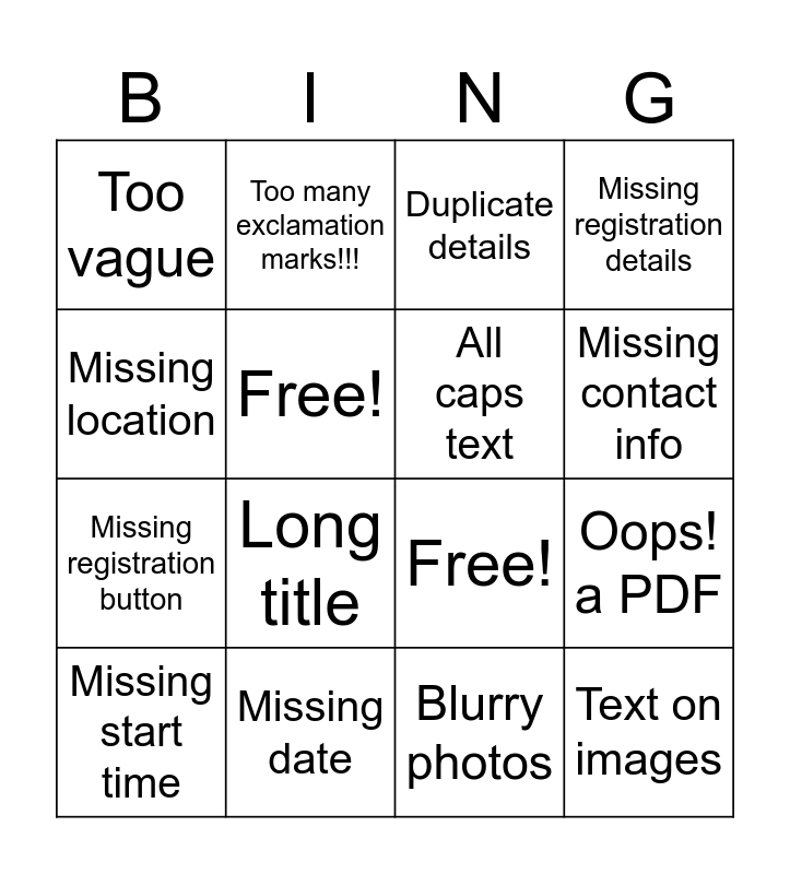 This bingo card has 16 words: Missing date, Oops! a PDF, Duplicate details, Too vague, Missing registration button, Too many exclamation marks!!!, Free!, Blurry photos, Missing location, Free!, Missing start time, Missing registration details, Long title, Missing contact info, All caps text and Text on images.
