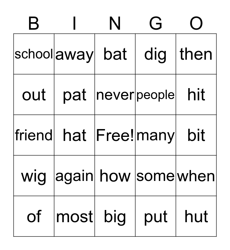 This bingo card has a free space and 24 words: again, most, never, of, then, school, out, away, many, how, people, friend, some, when, pat, put, bit, bat, hit, hat, hut, wig, dig and big.