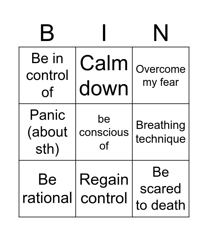 This bingo card has 13 words: Free!, Anxiety level, Be rational, Calm down, Panic (about sth), be conscious of, Be scared to death, Cure (an illness), Regain control, Be in control of, Breathing technique, Overcome my fear and Try therapy.