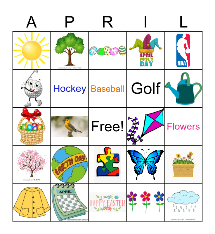This bingo card has 38 images, a free space and 6 words: Rain Showers, Flowers, Baseball, Golf, Basketball and Hockey.
