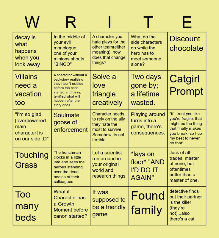 This bingo card has 30 words: What if Character has a Growth Moment before canon started?, Two characters being very weird about each other, Soulmate goose of enforcement, Differing sleep schedules, decay is what happens when you look away, A character you hate plays for the other team(either meaning), how does that change things?, A character without a backstory realising they hadn't existed before the book started and being terrified what will happen after the story ends., Let a scientist run around in your original world and research things, Playing around turns into a game, there's consequences., It was supposed to be a friendly game, "If I treat you like you're fragile, that might be the thing that finally makes you break, so I do my best to never do that", Character needs to rely on the ally they hate the most to survive. Somehow its not terrible., Found family, detective finds out their partner is the killer (they're not)...also there's a cat, Catgirl Prompt, The two of them are stuck in a bunker, alone together., *lays on floor* "AND I'D DO IT AGAIN", Touching Grass, The henchman clocks in a little late and sees the heroes standing over the dead bodies of their colleagues, Discount chocolate, "I'm so glad [overpowered main character] is on our side :D", You are the proud parent of something or someone that can end the world, In the middle of your evil monologue, one of your minions shouts "BINGO", Two days gone by; a lifetime wasted., Villains need a vacation too, What do the side characters do while the hero has to meet someone alone?, Jack of all trades, master of none, but oftentimes better than a master of one., Too many beds, Solve a love triangle creatively and Face the horrors.