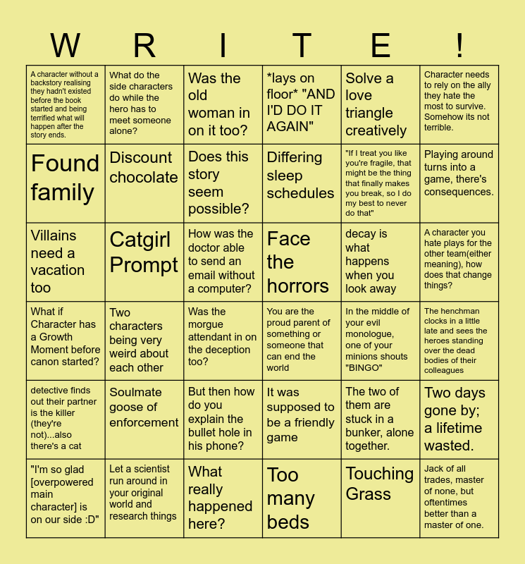 This bingo card has 36 words: What if Character has a Growth Moment before canon started?, Two characters being very weird about each other, What really happened here?, Differing sleep schedules, decay is what happens when you look away, A character you hate plays for the other team(either meaning), how does that change things?, A character without a backstory realising they hadn't existed before the book started and being terrified what will happen after the story ends., Let a scientist run around in your original world and research things, Was the old woman in on it too?, It was supposed to be a friendly game, "If I treat you like you're fragile, that might be the thing that finally makes you break, so I do my best to never do that", Character needs to rely on the ally they hate the most to survive. Somehow its not terrible., detective finds out their partner is the killer (they're not)...also there's a cat, Catgirl Prompt, Does this story seem possible?, *lays on floor* "AND I'D DO IT AGAIN", The two of them are stuck in a bunker, alone together., The henchman clocks in a little late and sees the heroes standing over the dead bodies of their colleagues, Found family, Discount chocolate, Was the morgue attendant in on the deception too?, You are the proud parent of something or someone that can end the world, In the middle of your evil monologue, one of your minions shouts "BINGO", Two days gone by; a lifetime wasted., Villains need a vacation too, What do the side characters do while the hero has to meet someone alone?, How was the doctor able to send an email without a computer?, Too many beds, Solve a love triangle creatively, Playing around turns into a game, there's consequences., "I'm so glad [overpowered main character] is on our side :D", Soulmate goose of enforcement, But then how do you explain the bullet hole in his phone?, Face the horrors, Touching Grass and Jack of all trades, master of none, but oftentimes better than a master of one..