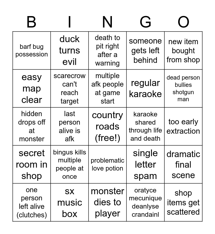 This bingo card has a free space and 44 words: upgrades stolen, shop items get scattered, one person left alive (dies), one person left alive (clutches), multiple people online on genshin, oratyce mecunique deanlyse crandainl, death to pit right after a warning, death to a monster right after a warning, new item bought from shop, sx music box, someone gets left behind, karaoke shared through life and death, problematic love potion, bingus kills multiple people at once, two big monsters in the same room, monster dies to player, monster dies of natural causes, hidden drops off at monster, pregame vc longer than 10 minutes, dead person bullies shotgun man, duck turns evil, game 1 death, moon phase, barf bug possession, really big thing breaks in extraction, too early extraction, "am i the only one alive", discord used to say "im dead", single letter spam, secret room in shop, everyone loses the final, dramatic final scene, innocent bystander gets killed by shotgun guy, monster in truck, last person alive is afk, at least four people die to same thing, everyone survives a round, only one person makes it back to truck last round, multiple afk people at game start, easy map clear, regular karaoke, nun can't reach target, scarecrow can't reach target and trap gets someone.