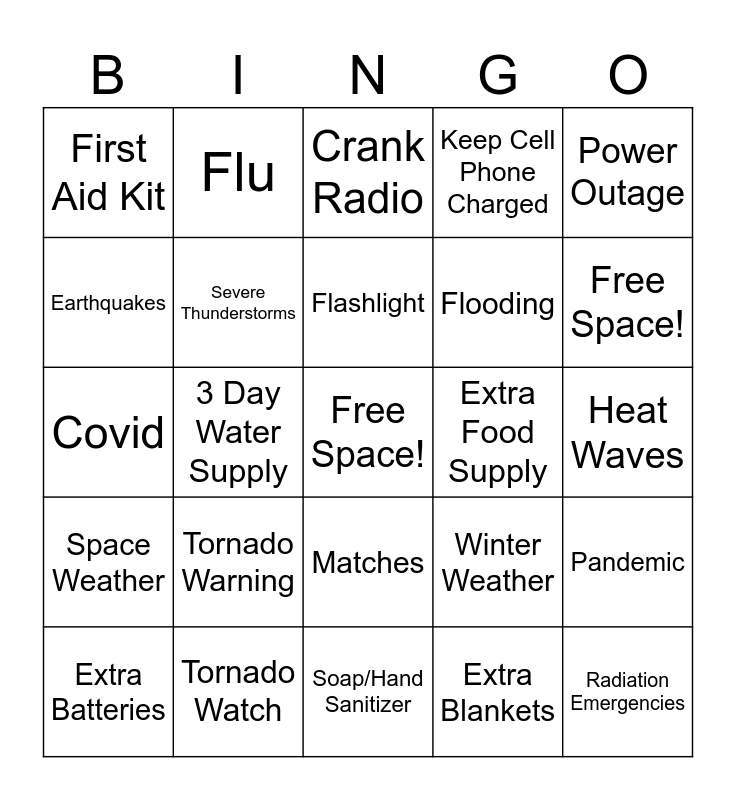 This bingo card has a free space and 24 words: Tornado Warning, Tornado Watch, Flashlight, Extra Batteries, Power Outage, First Aid Kit, Earthquakes, Flu, Extra Food Supply, Matches, Flooding, Covid, Winter Weather, Pandemic, Severe Thunderstorms, Extra Blankets, Heat Waves, Crank Radio, Free Space!, 3 Day Water Supply, Radiation Emergencies, Space Weather, Keep Cell Phone Charged and Soap/Hand Sanitizer.