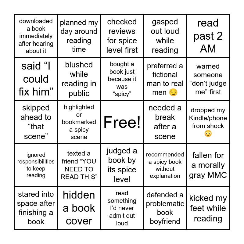 This bingo card has a free space and 40 words: stayed up all night reading a spicy book, skipped ahead to “that scene”, reread a spicy chapter immediately, blushed while reading in public, hidden a book cover, judged a book by its spice level, bought a book just because it was “spicy”, said “just one more chapter” and lied, read past 2 AM, ignored responsibilities to keep reading, highlighted or bookmarked a spicy scene, gasped out loud while reading, kicked my feet while reading, dropped my Kindle/phone from shock 😳, needed a break after a scene, texted a friend “YOU NEED TO READ THIS”, joined BookTok for recommendations, downloaded a book immediately after hearing about it, bought a book for one specific trope, checked reviews for spice level first, fallen for a morally gray MMC, defended a problematic book boyfriend, preferred a fictional man to real men 😏, said “I could fix him”, said “he could ruin me”, rooted for the villain, read something and questioned myself, said “this is unhinged”… and kept reading, finished a book in one sitting, immediately started the next book in a series, had a book hangover, stared into space after finishing a book, reread a favorite book more than twice, recommended a spicy book without explanation, warned someone “don’t judge me” first, read something I’d never admit out loud, hoped no one looked at my screen, closed my book quickly when someone walked by, planned my day around reading time and said “this is for the plot” 😏.