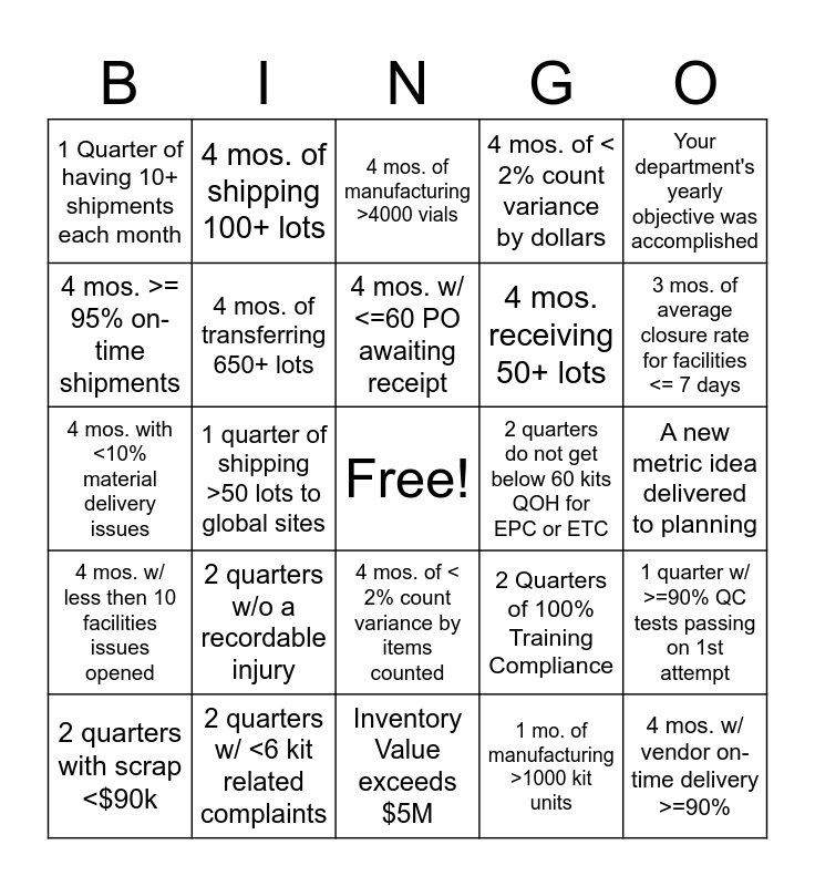 This bingo card has a free space and 24 words: 2 quarters w/o a recordable injury, 2 quarters w/ <6 kit related complaints, 4 mos. w/ <=60 PO awaiting receipt, 2 quarters with scrap <$90k, Your department's yearly objective was accomplished, 1 Quarter of having 10+ shipments each month, 4 mos. >= 95% on-time shipments, 4 mos. of shipping 100+ lots, 2 quarters do not get below 60 kits QOH for EPC or ETC, 4 mos. of < 2% count variance by items counted, 4 mos. receiving 50+ lots, 4 mos. with <10% material delivery issues, 2 Quarters of 100% Training Compliance, 1 quarter w/ >=90% QC tests passing on 1st attempt, 4 mos. of transferring 650+ lots, 1 mo. of manufacturing >1000 kit units, A new metric idea delivered to planning, 4 mos. of manufacturing >4000 vials, 3 mos. of average closure rate for facilities <= 7 days, 1 quarter of shipping >50 lots to global sites, 4 mos. w/ vendor on-time delivery >=90%, 4 mos. w/ less then 10 facilities issues opened, 4 mos. of < 2% count variance by dollars and Inventory Value exceeds $5M.
