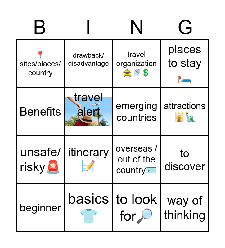 This bingo card has 1 images and 16 words: beginner, basics 👕, travel organization🚖🚿💲, places to stay🛏️, Benefits, drawback/ disadvantage, overseas / out of the country🪪, to discover, 📍sites/places/ country, travel alert, to look for🔎, attractions🕌🗽, unsafe/ risky🚨, itinerary📝, emerging countries and way of thinking.