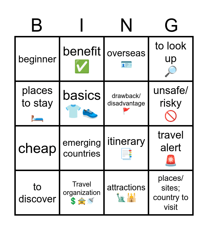 This bingo card has 16 words: Travel organization 💲🚖🚿, travel alert 🚨, overseas 🪪, beginner, cheap, benefit ✅, itinerary 📑, attractions 🗽🕌, places to stay 🛏️, basics 👕👟, to discover, to look up 🔎, emerging countries, unsafe/ risky 🚫, drawback/ disadvantage 🚩 and places/ sites; country to visit.