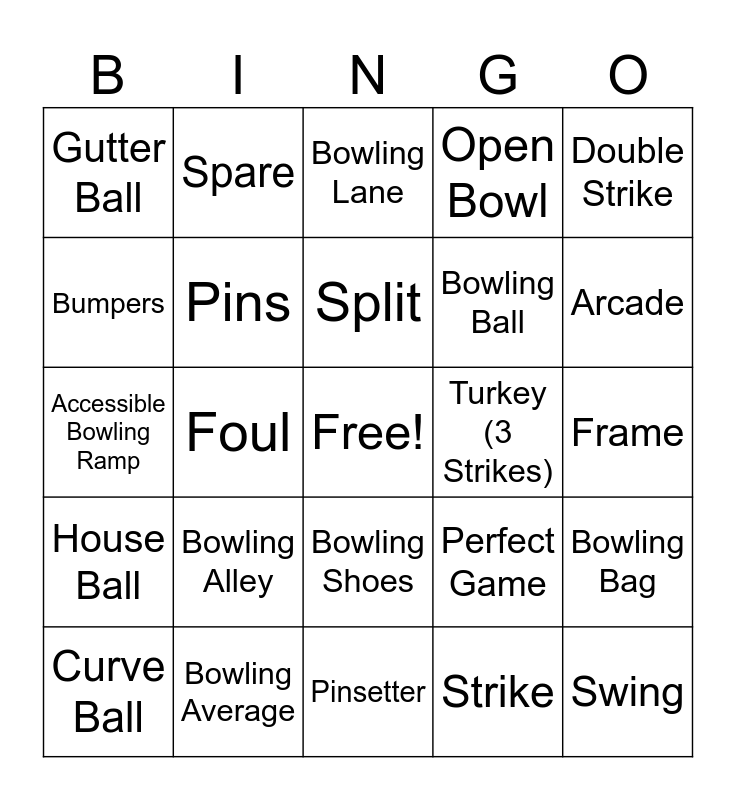 This bingo card has a free space and 24 words: Bowling Alley, Bowling Average, Split, Curve Ball, Double Strike, Gutter Ball, Bumpers, Spare, Turkey (3 Strikes), Bowling Shoes, Bowling Ball, Accessible Bowling Ramp, Perfect Game, Bowling Bag, Pins, Strike, Frame, Bowling Lane, Arcade, Foul, Swing, House Ball, Open Bowl and Pinsetter.
