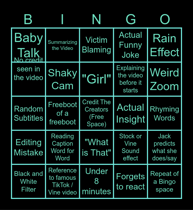 This bingo card has a free space and 34 words: Calling someone "bro", Forgets to react, Nothing Burger, Unnecessary Yelling, Editing Mistake, Shaky Cam, Rain Effect, Black and White Filter, Summarizing the Video, Weird Flex, "Girl", Victim Blaming, Random Tangent, Random Graphic, Actual Insight, Weird Zoom, Reference to famous TikTok / Vine video, Random Subtitles, Reading Caption Word for Word, Stock or Vine Sound effect, "What is That", "Oh No", Baby Talk, Rhyming Words, Under 8 minutes, Repeat of a Bingo space, Actual Funny Joke, Youtuber Accent, Explaining the video before it starts, No credit seen in the video, Weird Crop, Freeboot of a freeboot, Jack predicts what she does/say and Chat predicts what she does/say.