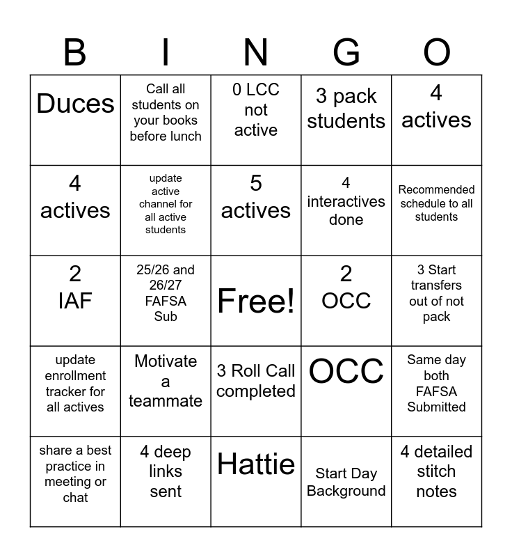 This bingo card has a free space and 34 words: Not on Missed opportunity list, Start Day Background, Showed 5 Active post love, 2 orientations, update enrollment tracker for all actives, update active channel for all active students, 4 actives, share a best practice in meeting or chat, Call all students on your books before lunch, Send 3 ME1000 sessions, 5 actives, 0 LCC not active, update enrollment tracker for all changed lives, enrollment, 2 OCC, Recommended schedule to all students, 4 deep links sent, 2 IAF, Motivate a teammate, OCC, 3 Roll Call completed, 70% engagement, Duces, 3 Start transfers out of not pack, Hattie, 4 detailed stitch notes, 3 pack students, Only 25/26 FAFSA Sub, 4 interactives done, 4 actives, Only 26/27 FAFSA Sub, 25/26 and 26/27 FAFSA Sub, Same day both FAFSA Submitted and Wear Green Shirt.