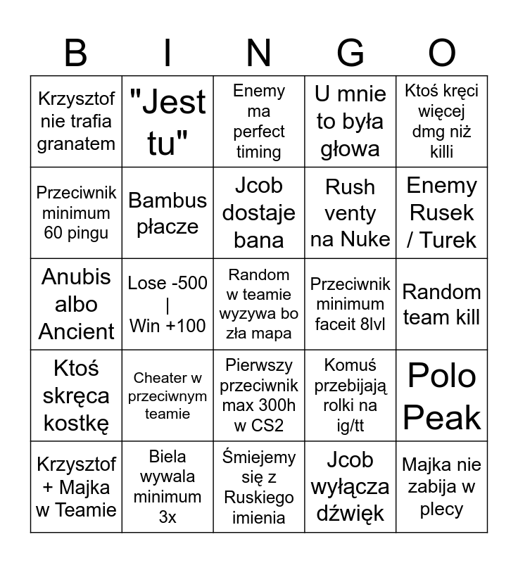 This bingo card has a free space and 24 words: Cheater w przeciwnym teamie, Biela wywala minimum 3x, Jcob dostaje bana, Krzysztof + Majka w Teamie, Ktoś kręci więcej dmg niż killi, Krzysztof nie trafia granatem, Przeciwnik minimum 60 pingu, "Jest tu", Przeciwnik minimum faceit 8lvl, Pierwszy przeciwnik max 300h w CS2, Rush venty na Nuke, Anubis albo Ancient, Komuś przebijają rolki na ig/tt, Polo Peak, Bambus płacze, Jcob wyłącza dźwięk, Random team kill, Enemy ma perfect timing, Enemy Rusek / Turek, Lose -500 | Win +100, Majka nie zabija w plecy, Ktoś skręca kostkę, U mnie to była głowa and Śmiejemy się z Ruskiego imienia.