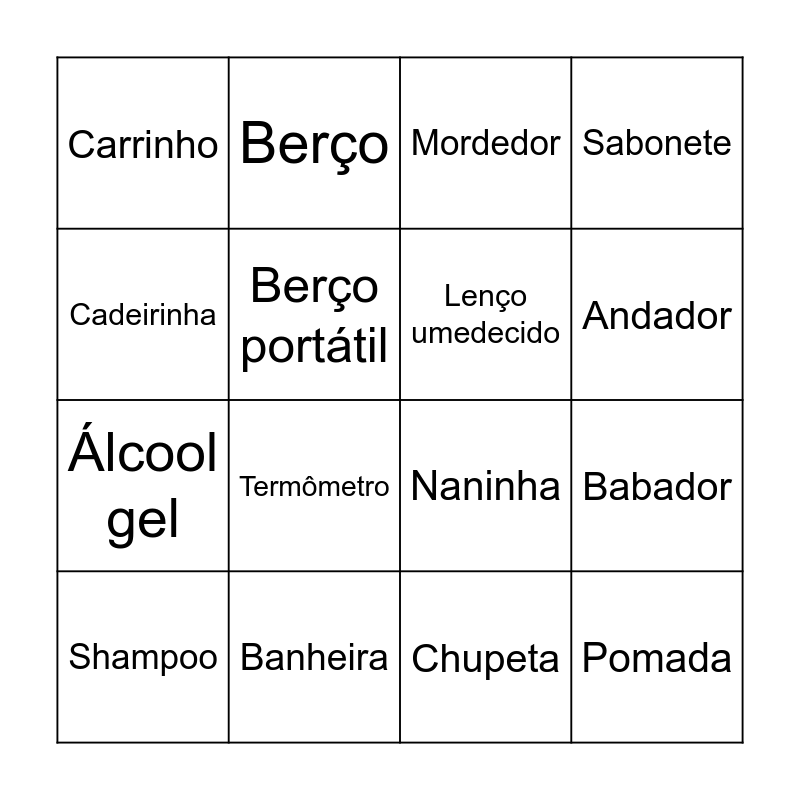 This bingo card has 30 words: Fralda, Mamadeira, Chupeta, Body, Carrinho, Berço, Lenço umedecido, Pomada, Talco, Banheira, Toalha, Babador, Meia, Sapatinho, Naninha, Cobertor, Cueiro, Termômetro, Escova de cabelo, Sabonete, Shampoo, Trocador, Mordedor, Andador, Cadeirinha, Berço portátil, Protetor de berço, Bolsa maternidade, Álcool gel and Cotonete.