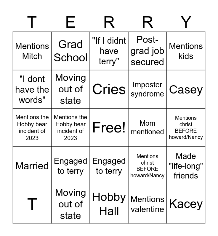 This bingo card has a free space and 48 words: Howard AND Nancy Terry, Kacey, T, Hobby Hall, Engaged to terry, Married, Grad School, Major you've never heard of, "I dont have the words", Overcame adversity, Moving out of state, Post-grad job secured, Made "life-long" friends, Mentions christ BEFORE howard/Nancy, Yvonne, Study abroad, Cries, Mom mentioned, "If I didnt have terry", Mentions kids, Mentions the Hobby bear incident of 2023, Mentions valentine, Mentions Mitch, Imposter syndrome, Howard AND Nancy Terry, Casey, T, Hobby Hall, Engaged to terry, Married, Grad School, Major you've never heard of, "I dont have the words", Overcame adversity, Moving out of state, Post-grad job secured, Made "life-long" friends, Mentions christ BEFORE howard/Nancy, Kyle, Study abroad, Cries, Mom mentioned, "If I didnt have terry", Mentions kids, Mentions the Hobby bear incident of 2023, Mentions valentine, Mentions Mitch and Imposter syndrome.