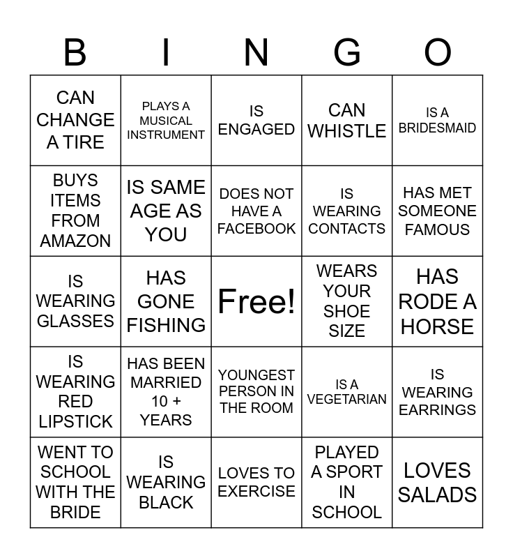 This bingo card has a free space and 34 words: HAS 2 PETS, PLAYED A SPORT IN SCHOOL, DOESN'T DRINK COFFEE, TRAVELED 1 HOUR + TO GET HERE, IS WEARING RED LIPSTICK, IS SAME AGE AS YOU, IS A BRIDESMAID, WENT TO SCHOOL WITH THE BRIDE, PLAYS A MUSICAL INSTRUMENT, IS LEFT-HANDED, DOES NOT HAVE A FACEBOOK, IS ENGAGED, IS A BUSINESS OWNER, IS RELATED TO THE BRIDE, WEARS YOUR SHOE SIZE, HAS MET SOMEONE FAMOUS, IS WEARING BLACK, IS WEARING GLASSES, HAS BEEN MARRIED 10 + YEARS, IS A VEGETARIAN, YOUNGEST PERSON IN THE ROOM, HAS 3 OR MORE CHILDREN, CAN CHANGE A TIRE, HAS RODE A HORSE, LOVES TO EXERCISE, LOVES SALADS, CAN WHISTLE, CAN COOK, IS WEARING CONTACTS, BUYS ITEMS FROM AMAZON, SHOPS ON SHEIN, HAS GONE FISHING, IS WEARING EARRINGS and HAS A TATTOO.