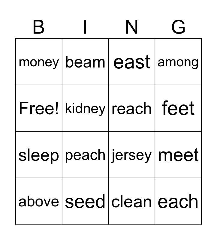 This bingo card has 16 words: seed, meet, east, money, sleep, beam, jersey, clean, Free!, kidney, above, among, peach, feet, reach and each.