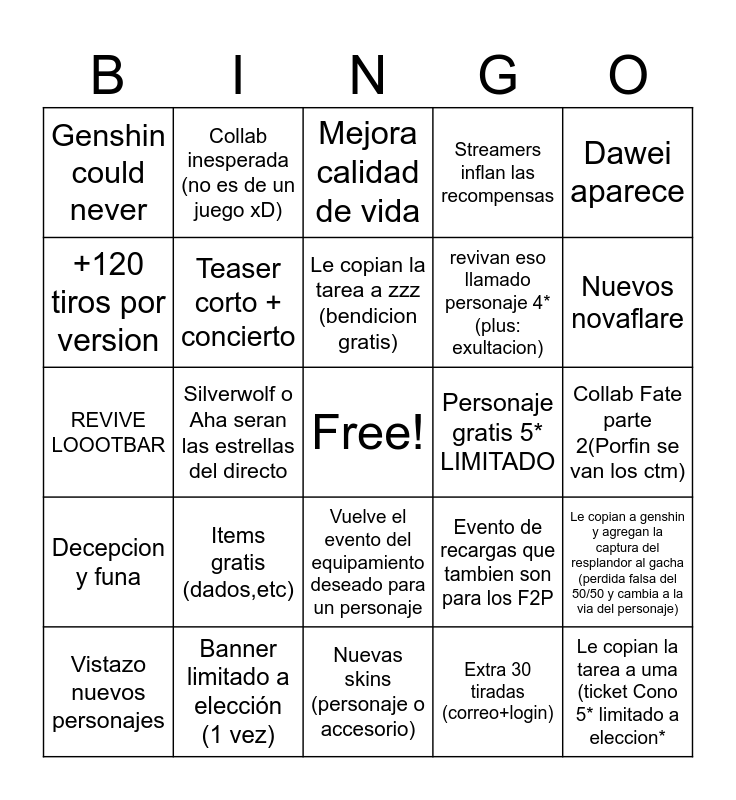This bingo card has a free space and 24 words: Items gratis (dados,etc), Banner limitado a elección (1 vez), Le copian la tarea a zzz (bendicion gratis), Vistazo nuevos personajes, Dawei aparece, Genshin could never, +120 tiros por version, Collab inesperada (no es de un juego xD), Personaje gratis 5* LIMITADO, Vuelve el evento del equipamiento deseado para un personaje, revivan eso llamado personaje 4* (plus: exultacion), REVIVE LOOOTBAR, Evento de recargas que tambien son para los F2P, Le copian a genshin y agregan la captura del resplandor al gacha (perdida falsa del 50/50 y cambia a la via del personaje), Teaser corto + concierto, Extra 30 tiradas (correo+login), Collab Fate parte 2(Porfin se van los ctm), Mejora calidad de vida, Nuevos novaflare, Silverwolf o Aha seran las estrellas del directo, Le copian la tarea a uma (ticket Cono 5* limitado a eleccion*, Decepcion y funa, Streamers inflan las recompensas and Nuevas skins (personaje o accesorio).