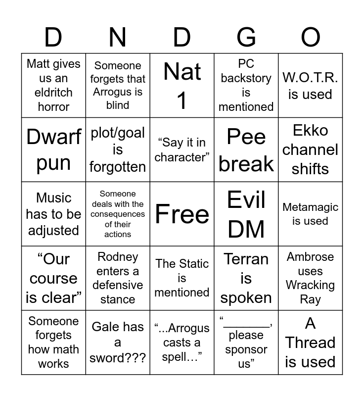 This bingo card has a free space and 33 words: “Aye”, Someone is confused, Someone deals with the consequences of their actions, Someone loses control, “Our course is clear”, plot/goal is forgotten, W.O.T.R. is used, Someone forgets how math works, Someone forgets that Arrogus is blind, Someone forgets to unmute, “Say it in character”, Nat 1, Nat 20, Good DM, Evil DM, Ekko channel shifts, Gale has a sword???, Music has to be adjusted, Rodney enters a defensive stance, Terran is spoken, The Static is mentioned, Eats a pizza, Matt gives us an eldritch horror, Metamagic is used, “...Arrogus casts a spell…”, A Thread is used, PC backstory is mentioned, Pee break, Dwarf pun, Ambrose uses Wracking Ray, Two people speak at the same time, “_______, please sponsor us” and Gale makes a deal.