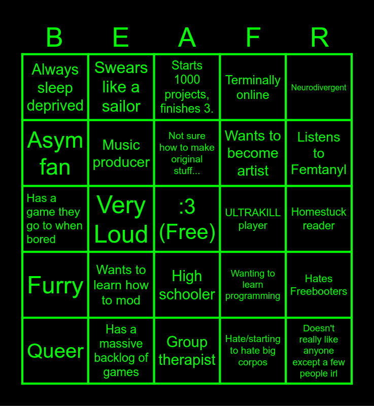 This bingo card has a free space and 34 words: Always conflicted when consuming media made by bad people, Hate/starting to hate big corpos, Conflicted whenever has money, Wants a whole lot, not a whole lotta money., Furry, Music producer, Neurodivergent, Queer, Swears like a sailor, Single and sad about it, Not sure how to make original stuff..., Starts 1000 projects, finishes 3., Envious of people with relationships, Good singer, ULTRAKILL player, Listens to Femtanyl, Has a massive backlog of games, Has a game they go to when bored, Wants to learn how to mod, Wanting to learn programming, High schooler, Was in really cringy fandom back then, Always sleep deprived, Homestuck reader, Group therapist, Doesn't really like anyone except a few people irl, Terminally online, Wants to learn animation, Wants to become artist, Asym fan, Unfortunately an Aethos/Irida fan, Very Loud, Hates Freebooters and Hates politics.