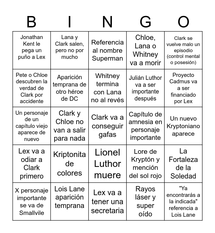 This bingo card has a free space and 24 words: Kriptonita de colores, Lois Lane aparición temprana, Whitney termina con Lana no al revés, X personaje importante se va de Smallvile, Clark se vuelve malo un episodio (control mental o posesión), Jonathan Kent le pega un puño a Lex, Pete o Chloe descubren la verdad de Clark por accidente, Lana y Clark salen, pero no por mucho, Capítulo de amnesia en personaje importante, Lionel Luthor muere, Julián Luthor va a ser importante después, Un personaje de un capítulo viejo aparece de nuevo, Lore de Kryptón y mención del sol rojo, La Fortaleza de la Soledad, Aparición temprana de otro héroe de DC, Rayos láser y super oído, Un nuevo Kryptoniano aparece, Referencia al nombre Superman, Proyecto Cadmus va a ser financiado por Lex, Clark y Chloe no van a salir para nada, "Ya encontrarás a la indicada" referencia a Lois Lane, Lex va a odiar a Clark primero, Chloe, Lana o Whitney va a morir and Lex va a tener una secretaria.