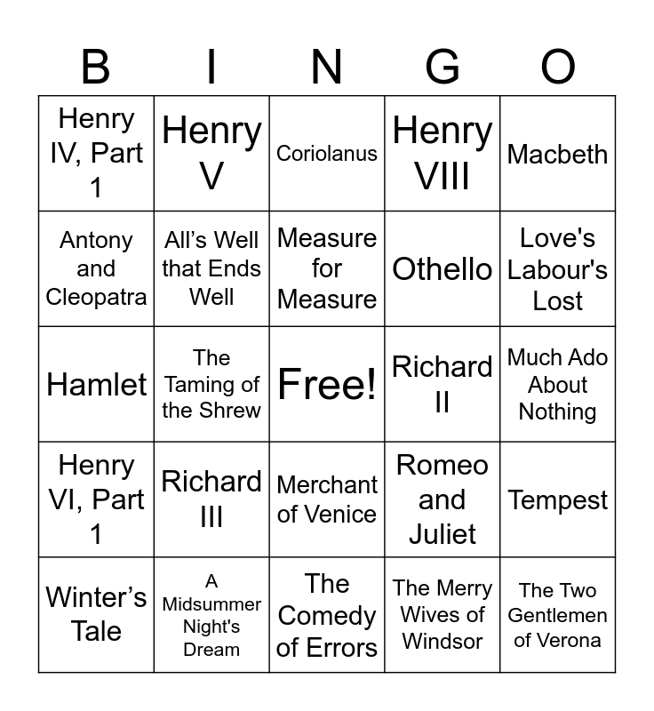 This bingo card has a free space and 30 words: A Midsummer Night's Dream, As You Like It, The Taming of the Shrew, Twelfth Night, Henry IV, Part 1, Coriolanus, All’s Well that Ends Well, Merchant of Venice, Richard II, The Comedy of Errors, Much Ado About Nothing, The Two Gentlemen of Verona, The Merry Wives of Windsor, King John, Love's Labour's Lost, Titus Andronicus, Romeo and Juliet, Henry VI, Part 1, Richard III, Macbeth, Hamlet, King Lear, Henry V, Othello, Antony and Cleopatra, Henry VIII, Tempest, Winter’s Tale, Measure for Measure and Julius Caesar.