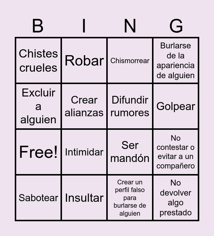 This bingo card has 20 words: No contestar o evitar a un compañero, Hacer sentir mal a alguien, Chismorrear, Ignorar, Sabotear, Excluir a alguien, Insultar, Chistes crueles, Free!, Robar, Intimidar, Ser mandón, Crear alianzas, No devolver algo prestado, Difundir rumores, Burlarse del discurso de alguien, Golpear, Burlarse de la apariencia de alguien, Crear un perfil falso para burlarse de alguien and Hacer sentir miedo o inseguridad.