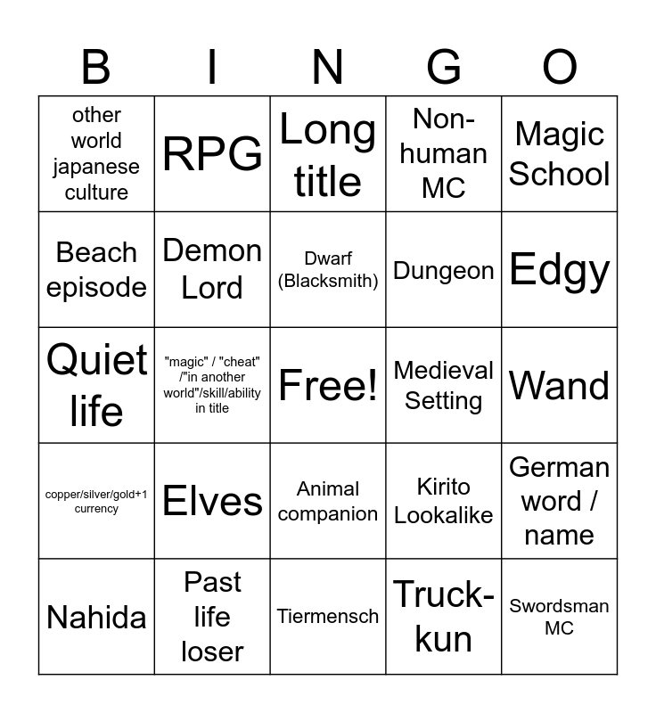 This bingo card has a free space and 34 words: OP MC, Truck-kun, Slavery, Harem, copper/silver/gold+1 currency, Demon Lord, Magic School, Nahida, RPG, Tournament, Dwarf (Blacksmith), Long title, Adventurer Guild, goddess, Medieval Setting, Edgy, Past life loser, Quiet life, Elves, Kirito Lookalike, Animal companion, Genius, other world japanese culture, Wand, Tiermensch, Swordsman MC, Non-human MC, feindliche Kirche, Dungeon, Beach episode, underrated skill is OP, "magic" / "cheat" /"in another world"/skill/ability in title, German word / name and fat/ugly guy = evil.