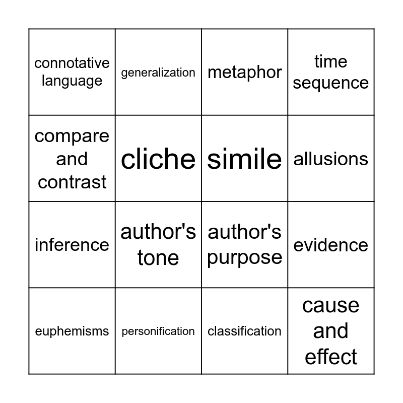 This bingo card has 16 words: personification, evidence, metaphor, connotative language, inference, generalization, author's purpose, classification, compare and contrast, cliche, euphemisms, time sequence, author's tone, allusions, simile and cause and effect.