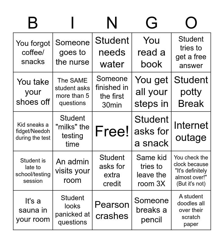 This bingo card has a free space and 34 words: Student falls asleep, Someone breaks a pencil, Student announces that the test was easy, Student asks what period is next, Student is late to school/testing session, The SAME student asks more than 5 questions, Student tries to get a free answer, It's a sauna in your room, Someone goes to the nurse, Student asks when lunch is, Someone finished in the first 30min, Student needs water, Teacher potty break, Your room is freezing, Student asks for a snack, Student potty Break, Student looks panicked at questions, Kid sneaks a fidget/Needoh during the test, An admin visits your room, Same kid tries to leave the room 3X, Student asks for extra credit, You brought coffee/ snacks, You forgot coffee/ snacks, Internet outage, Pearson crashes, A student doodles all over their scratch paper, You read a book, You play a game, You get all your steps in, You take your shoes off, Student takes shoes off, Student "milks" the testing time, You check the clock because "It's definitely almost over!" (But it's not) and You think about all the things you need to do.