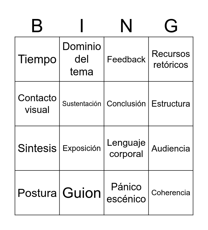 This bingo card has 32 words: Exposición, Argumento, Audiencia, Claridad, Coherencia, Conclusión, Contacto visual, Dicción, Dominio del tema, Entonación, Estructura, Feedback, Fluidez, Gesticulación, Guion, Interacción, Introducción, Lenguaje corporal, Manejo del espacio, Material de apoyo, Muletillas, Objetividad, Pánico escénico, Persuasión, Postura, Recursos retóricos, Sintesis, Sustentación, Tiempo, Vocabulario, Volumen and Exposición.