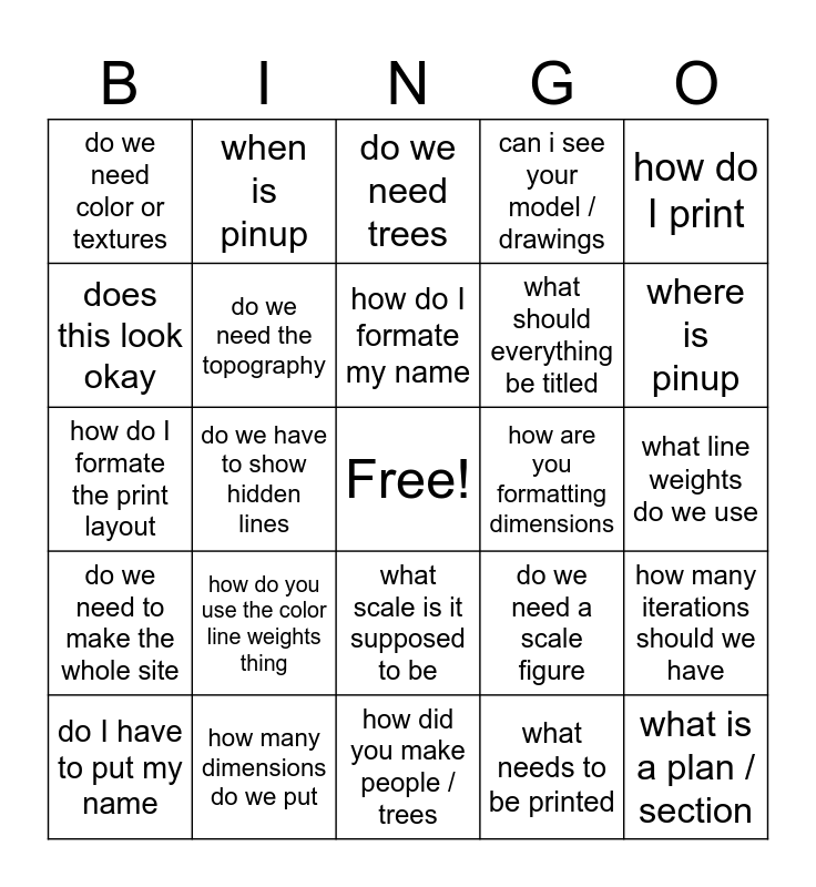 This bingo card has a free space and 24 words: how do you use the color line weights thing, how many dimensions do we put, how do I formate my name, do I have to put my name, how do I print, do we need color or textures, does this look okay, when is pinup, how are you formatting dimensions, what scale is it supposed to be, what should everything be titled, how do I formate the print layout, do we need a scale figure, how many iterations should we have, do we need the topography, what needs to be printed, what line weights do we use, do we need trees, where is pinup, do we have to show hidden lines, what is a plan / section, do we need to make the whole site, can i see your model / drawings and how did you make people / trees.