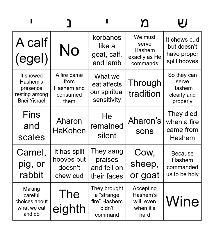 This bingo card has 30 words: The eighth, The 8th day of the Mishkan’s inauguration, Aharon HaKohen, Moshe, A calf (egel), korbanos like a goat, calf, and lamb, A fire came from Hashem and consumed them, They sang praises and fell on their faces, Aharon’s sons, They brought a “strange fire” Hashem didn’t command, They died when a fire came from Hashem, He remained silent, Accepting Hashem’s will, even when it’s hard, Wine, So they can serve Hashem clearly and properly, Split hooves and chewing cud, Cow, sheep, or goat, Camel, pig, or rabbit, It has split hooves but doesn’t chew cud, It chews cud but doesn’t have proper split hooves, Fins and scales, Salmon, No, Through tradition, It showed Hashem’s presence resting among Bnei Yisrael, We must serve Hashem exactly as He commands, Because Hashem commanded us to be holy, Making careful choices about what we eat and do, What we eat affects our spiritual sensitivity and By following mitzvos carefully, even when we don’t fully understand.