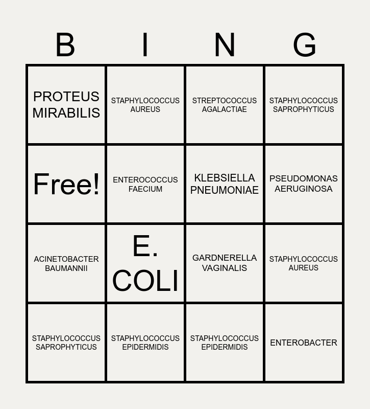 This bingo card has 39 words: E. COLI, E. COLI, E. COLI, KLEBSIELLA PNEUMONIAE, KLEBSIELLA PNEUMONIAE, KLEBSIELLA OXYTOCA, PSEUDOMONAS AERUGINOSA, PSEUDOMONAS FLUORESCENS/PUTIDA, Free!, ENTEROBACTER, STAPHYLOCOCCUS AUREUS, STAPHYLOCOCCUS SAPROPHYTICUS, STAPHYLOCOCCUS SAPROPHYTICUS, STAPHYLOCOCCUS EPIDERMIDIS, STAPHYLOCOCCUS EPIDERMIDIS, STAPHYLOCOCCUS EPIDERMIDIS, STREPTOCOCCUS AGALACTIAE, PROTEUS MIRABILIS, PROTEUS VULGARIS, ENTEROCOCCUS FAECALIS, ENTEROCOCCUS FAECIUM, GARDNERELLA VAGINALIS, ACINETOBACTER BAUMANNII, E. COLI, KLEBSIELLA PNEUMONIAE, KLEBSIELLA OXYTOCA, PSEUDOMONAS AERUGINOSA, PSEUDOMONAS FLUORESCENS/PUTIDA, ENTEROBACTER, STAPHYLOCOCCUS AUREUS, STAPHYLOCOCCUS SAPROPHYTICUS, STAPHYLOCOCCUS EPIDERMIDIS, STREPTOCOCCUS AGALACTIAE, PROTEUS MIRABILIS, PROTEUS VULGARIS, ENTEROCOCCUS FAECALIS, ENTEROCOCCUS FAECIUM, GARDNERELLA VAGINALIS and ACINETOBACTER BAUMANNII.