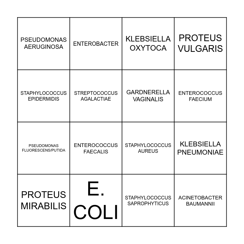 This bingo card has 16 words: E. COLI, KLEBSIELLA PNEUMONIAE, KLEBSIELLA OXYTOCA, PSEUDOMONAS AERUGINOSA, PSEUDOMONAS FLUORESCENS/PUTIDA, ENTEROBACTER, STAPHYLOCOCCUS AUREUS, STAPHYLOCOCCUS SAPROPHYTICUS, STAPHYLOCOCCUS EPIDERMIDIS, STREPTOCOCCUS AGALACTIAE, PROTEUS MIRABILIS, PROTEUS VULGARIS, ENTEROCOCCUS FAECALIS, ENTEROCOCCUS FAECIUM, GARDNERELLA VAGINALIS and ACINETOBACTER BAUMANNII.