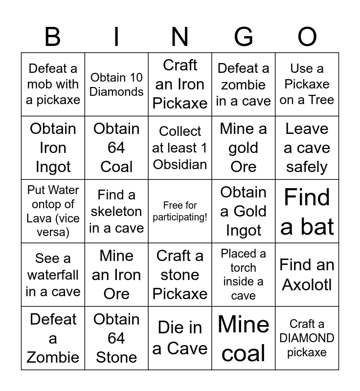 This bingo card has a free space and 24 words: Mine an Iron Ore, Obtain 64 Stone, Collect at least 1 Obsidian, Defeat a Zombie, Use a Pickaxe on a Tree, Defeat a mob with a pickaxe, Obtain Iron Ingot, Obtain 10 Diamonds, Obtain a Gold Ingot, Craft a stone Pickaxe, Mine a gold Ore, Put Water ontop of Lava (vice versa), Placed a torch inside a cave, Find an Axolotl, Obtain 64 Coal, Mine coal, Find a bat, Craft an Iron Pickaxe, Leave a cave safely, Find a skeleton in a cave, Craft a DIAMOND pickaxe, See a waterfall in a cave, Defeat a zombie in a cave and Die in a Cave.
