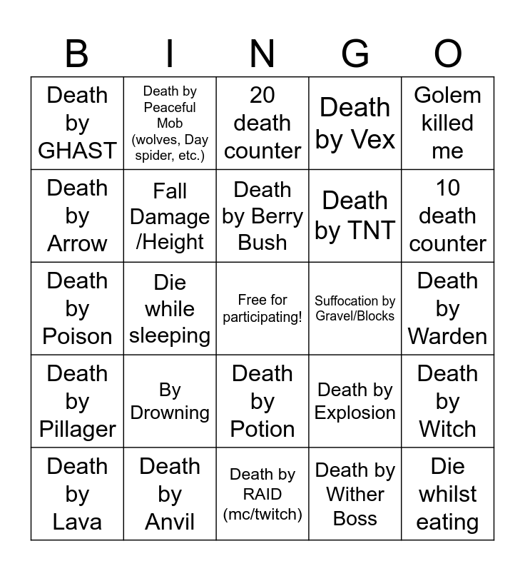This bingo card has a free space and 24 words: By Drowning, Death by Anvil, Death by Berry Bush, Death by Lava, Golem killed me, Death by GHAST, Death by Arrow, Death by Peaceful Mob (wolves, Day spider, etc.), Suffocation by Gravel/Blocks, Death by Potion, Death by TNT, Death by Poison, Death by Explosion, Death by Witch, Fall Damage /Height, Death by Wither Boss, Death by Warden, 20 death counter, 10 death counter, Die while sleeping, Die whilst eating, Death by Pillager, Death by Vex and Death by RAID (mc/twitch).