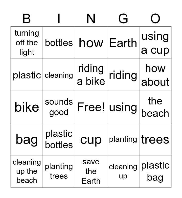 This bingo card has a free space and 24 words: plastic bottles, planting trees, riding a bike, cleaning up the beach, using a cup, turning off the light, plastic, bottles, using, cup, riding, bike, planting, trees, cleaning, cleaning up, the beach, how, how about, sounds good, plastic bag, bag, Earth and save the Earth.