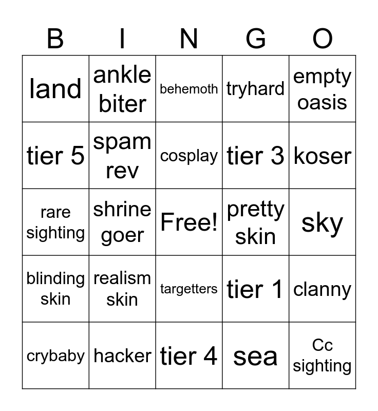 This bingo card has a free space and 27 words: tier 1, tier 2, tier 3, tier 4, tier 5, behemoth, ankle biter, blinding skin, pretty skin, clanny, rare sighting, tryhard, crybaby, hacker, koser, toxic loser, spam rev, cosplay, realism skin, land, sky, sea, shrine goer, Cc sighting, targetters, empty oasis and peaceful oasis.