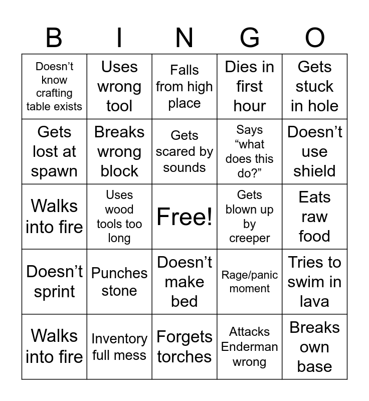 This bingo card has a free space and 24 words: Punches stone, Inventory full mess, Gets scared by sounds, Walks into fire, Gets stuck in hole, Doesn’t know crafting table exists, Gets lost at spawn, Uses wrong tool, Gets blown up by creeper, Doesn’t make bed, Says “what does this do?”, Walks into fire, Rage/panic moment, Tries to swim in lava, Breaks wrong block, Attacks Enderman wrong, Eats raw food, Falls from high place, Doesn’t use shield, Uses wood tools too long, Breaks own base, Doesn’t sprint, Dies in first hour and Forgets torches.