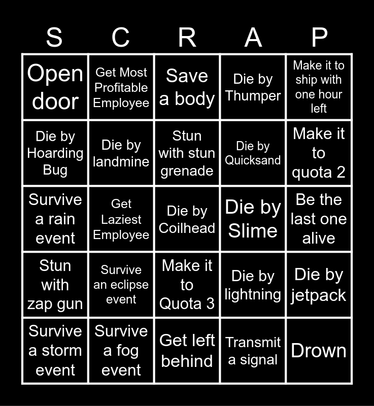 This bingo card has 55 words: Die by Bracken, Get Laziest Employee, Use a noisemaking item, Die by Thumper, Die by Giant, Die by Eyeless Dogs, Die by landmine, Die by Spider, Die by Slime, Get Most Injuries Sustained, Die by Hoarding Bug, Die by turret, Make it to Quota 3, Kill an enemy, Die by Girl, Remove the apparatus, Get Most Profitable Employee, Save a body, Get Paranoid Employee, Be the last one alive, Survive a storm event, Survive a fog event, Die by Coilhead, Die by Quicksand, Survive a flood event, Survive a rain event, Survive an eclipse event, Find an item worth greater than 90 credit, Die by lightning, Drown, Get bees by yourself, Die by fall damage, Make it to quota 4, Make it to quota 5, Make it to ship with one hour left, Stun with zap gun, Kill with Shotgun, Stun with stun grenade, Disable turret, Disable landmine, Open door, Buy a fish, Buy pajama man plush, Buy jack o lantern, Die by jetpack, Die by nutcracker, Die by mask, Get left behind, Make it to quota 6, Make it to quota 2, Die by delivery pod, Get the boombox, play music for slime, Transmit a signal and Get ejected.