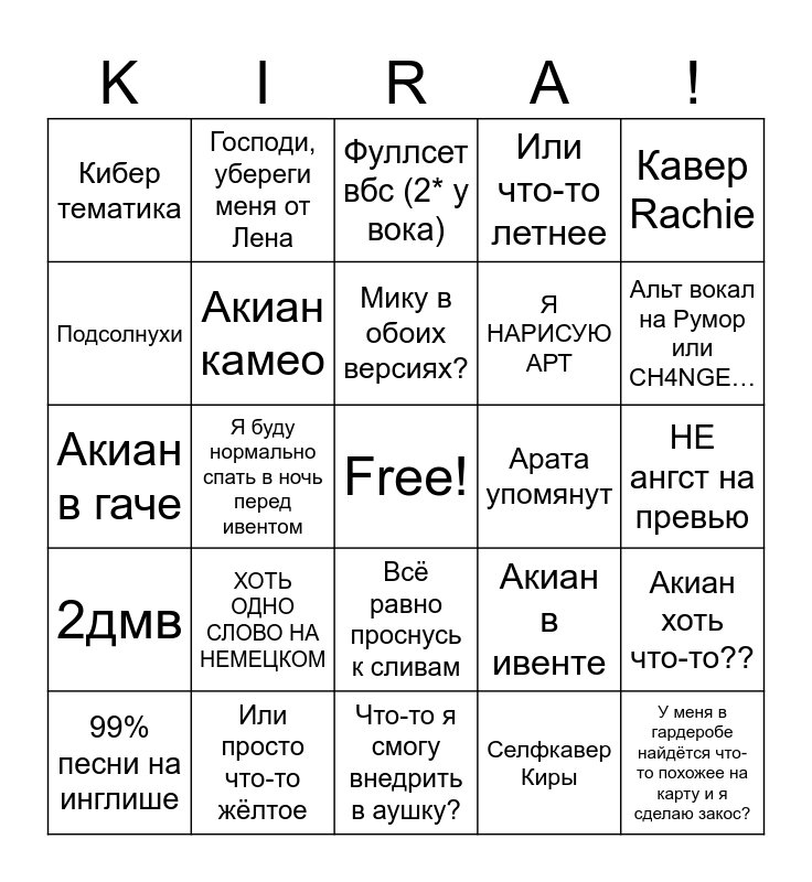 This bingo card has a free space and 24 words: 99% песни на инглише, ХОТЬ ОДНО СЛОВО НА НЕМЕЦКОМ, Мику в обоих версиях?, Селфкавер Киры, Кавер Rachie, Кибер тематика, Господи, убереги меня от Лена, Фуллсет вбс (2* у вока), Арата упомянут, НЕ ангст на превью, Акиан в гаче, Акиан камео, Акиан в ивенте, Акиан хоть что-то??, Подсолнухи, Или просто что-то жёлтое, Что-то я смогу внедрить в аушку?, Или что-то летнее, Альт вокал на Румор или CH4NGE…, 2дмв, Я буду нормально спать в ночь перед ивентом, Всё равно проснусь к сливам, Я НАРИСУЮ АРТ and У меня в гардеробе найдётся что-то похожее на карту и я сделаю закос?.