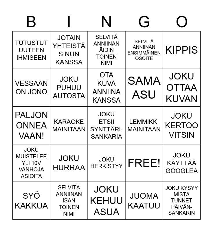 This bingo card has 25 words: JOKU HURRAA, JOKU KEHUU ASUA, OTA KUVA ANNIINA KANSSA, SYÖ KAKKUA, KIPPIS, TUTUSTUT UUTEEN IHMISEEN, VESSAAN ON JONO, JOTAIN YHTEISTÄ SINUN KANSSA, LEMMIKKI MAINITAAN, JOKU HERKISTYY, SAMA ASU, PALJON ONNEA VAAN!, FREE!, JOKU KÄYTTÄÄ GOOGLEA, JOKU PUHUU AUTOSTA, JOKU KYSYY MISTÄ TUNNET PÄIVÄN-SANKARIN, JOKU KERTOO VITSIN, SELVITÄ ANNIINAN ÄIDIN TOINEN NIMI, JOKU OTTAA KUVAN, KARAOKE MAINITAAN, JOKU ETSII SYNTTÄRI-SANKARIA, SELVITÄ ANNIINAN ISÄN TOINEN NIMI, JOKU MUISTELEE YLI 10V VANHOJA ASIOITA, SELVITÄ ANNIINAN ENSIMMÄINEN OSOITE and JUOMA KAATUU.