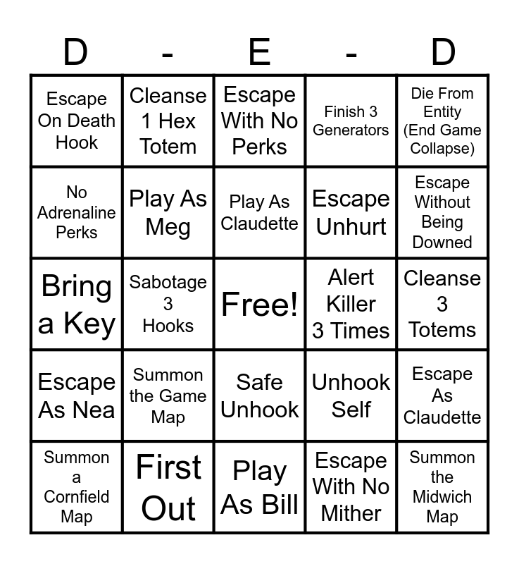 This bingo card has a free space and 69 words: Escape As Dwight, Cleanse 3 Totems, Killer Blind, Escape With New Item, First Out, Escape As Meg, Finish 3 Generators, Killer Stun, Die From Entity (End Game Collapse), Last Out, Escape As Claudette, Open 3 Chests, Escape On Death Hook, Escape With No Perks, Escape As Jake, Sabotage 3 Hooks, Safe Unhook, Escape Unhurt, Rescue A Dying Survivor, Escape As Nea, Alert Killer 3 Times, Unhook Self, Escape Without Being Downed, Rescue A Carried Survivor, Escape As Bill, Self Heal 3 States, Open Gate, Hatch Escape, Escape With No Mither, Escape As David, Cleanse 1 Hex Totem, Escape Killer Grasp, Escape with Purple+ Item, Killer DC, Use All Adrenaline Perks, Leave a Purple+ Item You Brought, No Aura Perks, Bring a Purple+ Item, No Adrenaline Perks, Never Heal All Game, Summon the Game Map, Summon the Midwich Map, Summon the Hawkins Map, Summon the Ormon Map, Summon the Lery's Map, Summon a Cornfield Map, Summon a Swamp Map, All Aura Perks, Play As Dwight, Play As Meg, Play As Claudette, Play As Jake, Play As Nea, Play As Bill, Play As David, Bring a Toolbox, Bring a Health Kit, Bring a Map, Bring a Flashlight, Bring a Key, Get Mori'd, Take a Protection Hit For a Survivor, Use All Dwight Perks, Use All Meg Perks, Use All Claudette Perks, Use All Jake Perks, Use All Nea Perks, Use All Bill Perks and Use All David Perks.
